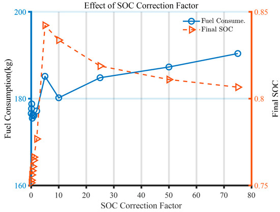 The total fuel consumption and SOC after the end of the operation, according to the SOC correction factor, are shown in Figure 16. In this study, various SOC correction factors were applied to analyze their effects on SOC recovery behavior and fuel consumption. As shown in Figure 16, changes in the SOC and fuel consumption were more sensitive when the correction factor was below 10. Therefore, finer intervals were selected in this range to capture these variations more accurately. In contrast, when the correction factor exceeded 10, the final SOC values stabilized around 0.80, and the fuel consumption gradually increased without abrupt changes. To avoid redundancy while maintaining representativeness, selected values such as 30 and 50 were used in the higher range. As the SOC correction factor increases, the battery SOC gradually recovers when the factor is below 5. However, beyond a certain threshold, the battery SOC exhibits excessive recovery. This occurs when excessive charging takes place during the later stages of the operational profile, leading to overcharging instead. When the SOC correction factor exceeds 25, it immediately compensates for SOC differences to sustain the SOC, so it is strongly maintained at a certain SOC. However, this leads to deviations from the optimal control solution, gradually increasing fuel consumption. Since determining the optimal SOC correction factor is challenging, the control system designer must select an appropriate value based on the operation plan and battery charging strategy, ensuring that the remaining battery SOC that must be maintained after the end of the operation.