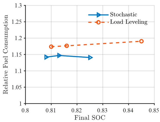 The battery SOC at the final termination point is different depending on each control strategy and the SOC correction factor setting. When the final battery SOC differs, a direct comparison of fuel consumption becomes difficult. Therefore, as shown in Figure 18, the trend of total fuel consumption was analyzed based on battery SOC. By comparing the total fuel consumption with respect to the final SOC, the performance difference between the stochastic control strategy and the load leveling method can be identified. The stochastic control strategy shows about a 3% reduction in fuel consumption compared to the load leveling method. In the case of large-scale systems such as hybrid electric propulsion ships operating over long durations and distances, even a 3% improvement in propulsion efficiency can lead to an annual reduction of tens to hundreds of tons of fuel consumption, accompanied by a corresponding decrease in CO2 and NOx [7]. These findings indicate that even a 3% efficiency improvement yields substantial operational and environmental benefits and serves as a quantitative basis supporting the commercial viability of eco-friendly ship technologies, in alignment with the IMO’s decarbonization objectives [6].