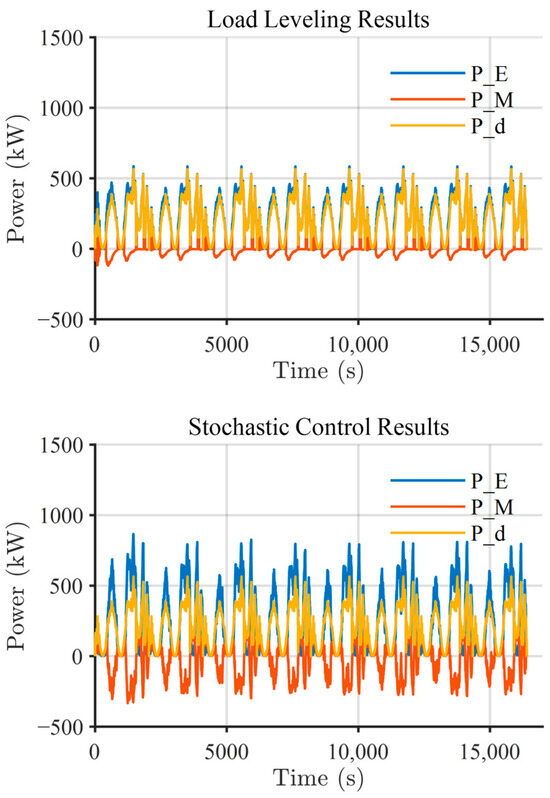 Power management results from two kinds of control strategies (upper: load leveling control; lower: stochastic control).