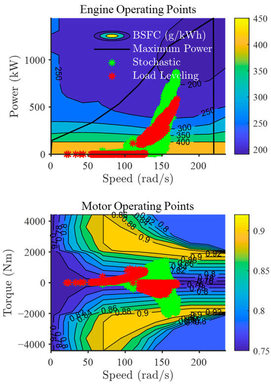 The performance results were analyzed from the perspective of power distribution between energy sources. Figure 19 presents the comparison of engine power () and electric propulsion power () relative to the ship demanded power () under both the load leveling control strategy and the stochastic control strategy. Interestingly, in the stochastic control strategy, both engine power and electric charging power are used at a higher level compared to the load leveling control strategy. In contrast, in the case of the load leveling control strategy, electric propulsion is only utilized at powers below 100 kW, so the engine power does not change significantly. The reason why total fuel consumption can be reduced despite increased engine and motor power is shown in Figure 20. Compared to the results of the load leveling control strategy represented by the red points, the operating points of the stochastic control strategy represented by the green points can be seen to be closer to the efficient operating ranges of the engine and motor. In the engine map, the optimal efficiency region is indicated in blue, while in the motor map, it is represented in yellow. As a result, the stochastic control strategy achieves higher efficiency than the load leveling control strategy. However, since the stochastic control strategy establishes control solutions based on a probabilistic model, it may show slight differences in each operational simulation.
