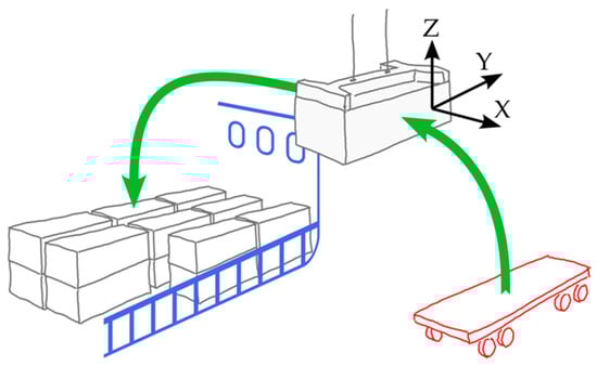 Explanation of a typical handling procedure performed by a port quay crane transporting the shipping container from a truck to a ship using a spreader mechanism (the red arrow shows the direction of movement of the container during the examined handling procedure).
