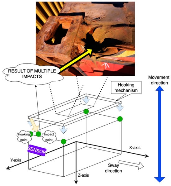 They may present as minor vibrations, which could appear inconsequential; however, they have the potential to accumulate damage over time or as significant jolts that pose immediate risks to the integrity of the container and the safety of the operation, with incidents occurring in the shafts of the vessels. Each type of impact contributes differently to the potential degradation or damage of the container, as illustrated in Figure 2 (upper side).