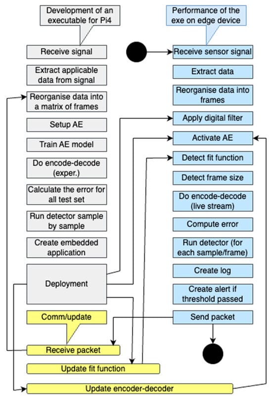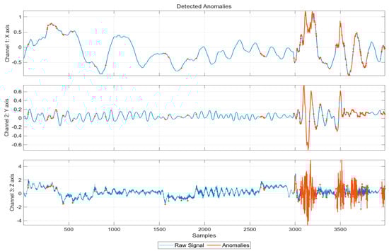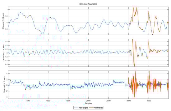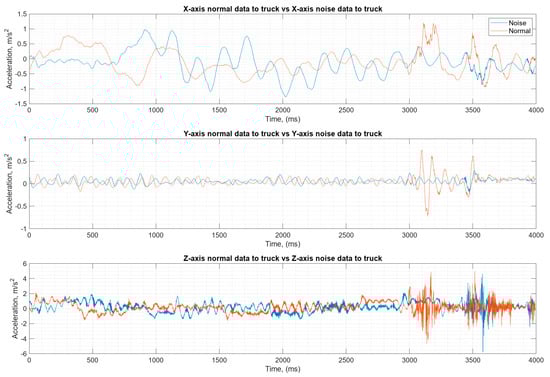 By analysing these two datasets side by side, the research team evaluated the accuracy and reliability of the detection framework in distinguishing between normal operational conditions and scenarios involving significant impacts. This dual-dataset approach was instrumental in verifying the system’s effectiveness in real-world situations. It provided critical insights into its capacity to enhance safety and operational efficiency in container handling and transportation environments. Here, a “normal” operation with a small number of low-energy actual impacts is compared to a “noisy” operation with a higher count of impacts of higher energies, all for the X, Y, and Z axes. Also, a previously developed autoencoder integration technique (see Figure 5 []) was used again, as it has already proven its capability to work with the apparatus. We would like to highlight that existing container monitoring systems heavily rely on remote cloud processing, which can lead to latency issues, data loss, and a high degree of dependency on continuous network connectivity.