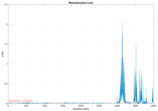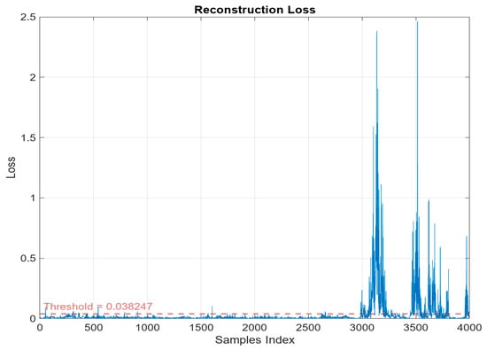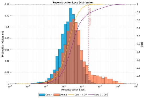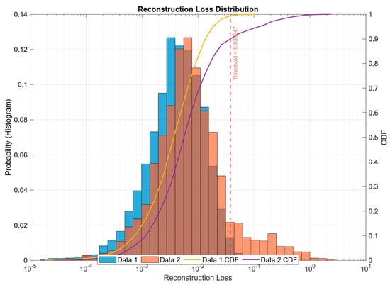 - Model Online Validation. In this phase, only the normal data from the validation set is processed through the trained network. After reconstructing this data, the combined loss values of RMSE for each sample are computed. Given the potential presence of a few unmatched noise samples and to ensure the model’s robustness, the loss value representing 95% of the normal data is selected as the threshold for detecting true anomalies (anomalous regions).