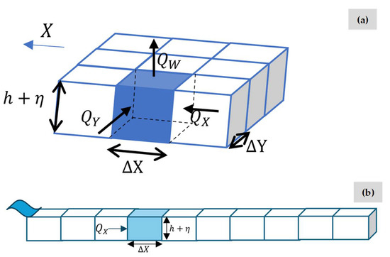 where, = flow in the main direction of the channel, = water surface level in the -axis, = flow area in the -axis (), = mean water depth, = water level, = time step, and are the size steps, = resistance coefficient, = time, = gravitational acceleration, and = . Details of the demonstration of Equation (3) can be found in Arrieta-Pastrana et al. (2025) [23].