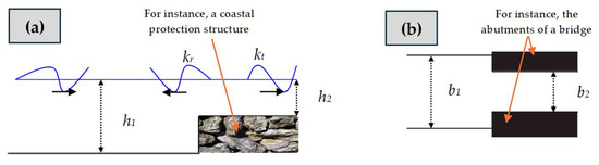where, = transmission coefficient, = Reflection coefficient, = Wave celerity, and = widths before and after a constriction, and and = depths before and after a constriction.
