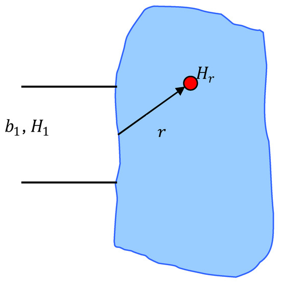 Applying the energy conservation equation between an aperture of width and a semicircle of radius , Equation (16) is obtained for estimating the wave’s amplitude at a distance from the source. The schematisation of these structures is presented in Figure 4. This expression can be used to correct the level function: