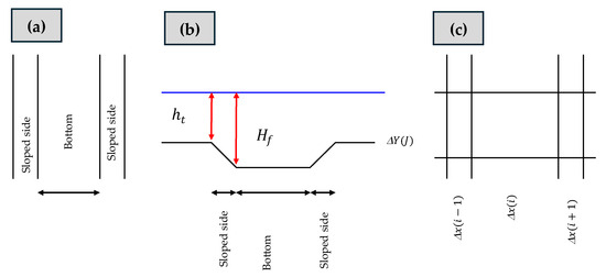 The approach taken in the proposed model involves discretising the channel into elements corresponding to the width of the channel bed and the widths of the slopes (see Figure 5). This method has the disadvantage of resulting in significant elements alongside very small elements, which may lead to potential model instability. This is because the mathematical expressions used in the model calculations do not allow for the independent terms of the solution matrix to be zero, ensuring that a unique solution always exists.