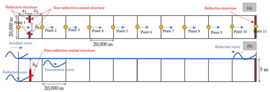 where, represents the channel length, denotes the water level of the incident wave, corresponds to the combined water level of the incident and reflected waves, and is the horizontal velocity along the -axis.