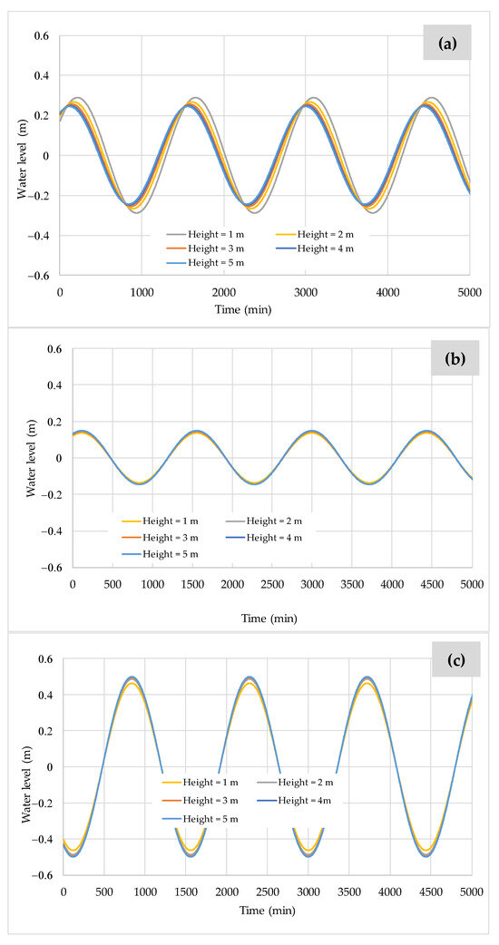 Water level variations for Scenario No. 1 with different heights of the coastal structure at: (a) Point 1; (b) Point 2; and (c) Point 11.