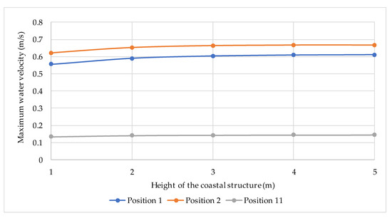 Figure 8 presents the maximum water velocities attained along the channel for the different heights of the coastal structure. The highest velocities occur at Point 2, due to the contraction between Points 1 and 2. For structure heights of 4 and 5 m, the maximum velocity reaches 0.67 m/s at this location. In contrast, the lowest velocities are observed at section 11 due to the reflective structure positioned near the downstream end, with an average value of approximately 0.14 m/s.