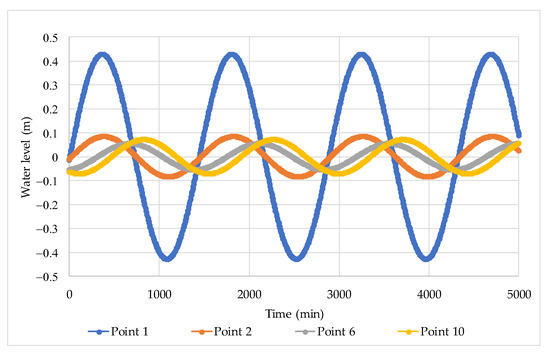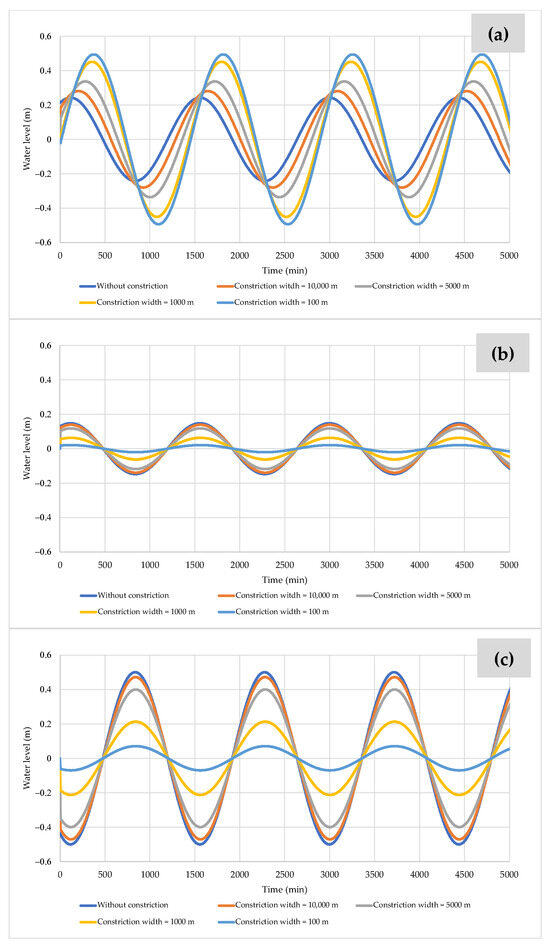 The highest water level is achieved without a constriction with a maximum value of 0.15 m, while the lowest value—0.02 m—is observed for a constriction width of 100 m, as presented in Figure 9b. Figure 9c shows the water levels computed at Point 11, where an increase in elevation is again detected due to a reflective structure situated at the downstream boundary.