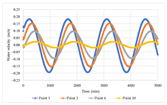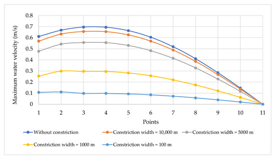 Figure 10 illustrates the maximum water velocities along Points 1 to 11 for various constriction widths within the channel. The results indicate that greater constriction widths are associated with higher peak velocities. For example, a constriction width of 5000 m results in a maximum velocity of 0.56 m/s, whereas a width of 1000 m yields a value of 0.30 m/s.