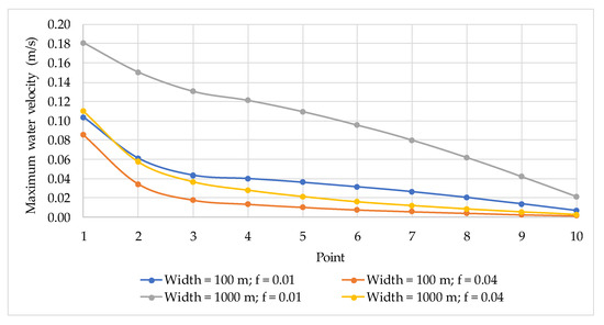 The following simulations consider two channel widths () of 1000 and 100 m, each evaluated with friction coefficients () of 0.01 and 0.04.