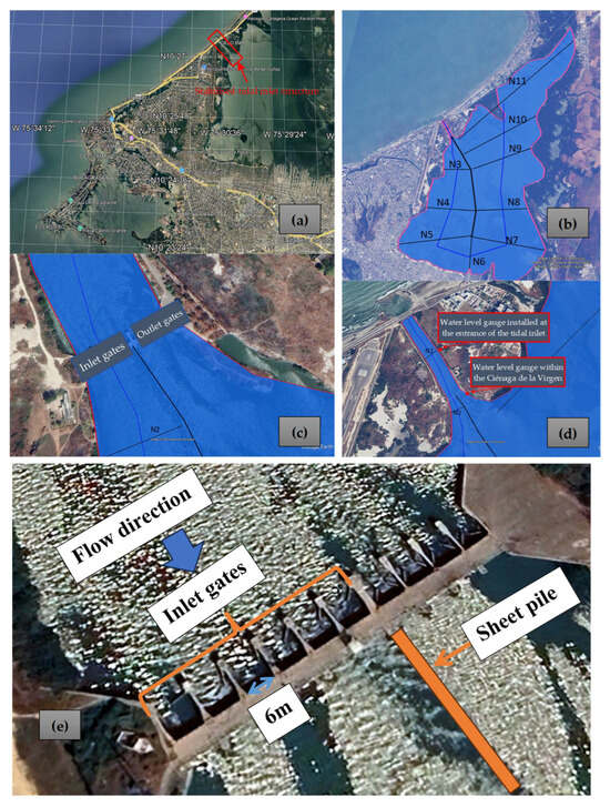 Geospatial information for model implementation: (a) general location of the Stabilised Tidal Inlet Structure; (b) distribution of the eleven cross-sections (N1 to N11) along the lagoon channel; (c) position of the inlet and outlet gates; (d) placement of water level gauge stations; and (e) flow direction from the sea towards the Ciénaga de la Virgen.