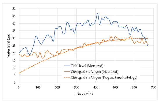 Figure 15 shows the segment of the water level time series recorded on 25 November 2008 at the Stabilised Tidal Inlet Structure (STIS) and within the Ciénaga de la Virgen, corresponding to the operational phase in which the inflow gates were open, and the outflow gates remained closed. The maximum water level measured at the tidal boundary was 46.72 cm, while within the Ciénaga de la Virgen, it reached 31.0 cm at minute 480. Cross-section N11 is aligned with the water level gauge station inside the Ciénaga de la Virgen. Using the proposed modelling methodology, the comparison between measured and simulated water levels at cross-section N11 is also presented. The results indicate that the methodology effectively represents water level dynamics in systems with coastal hydraulic control structures. In this case, the model captures the observed water level trend from minute 190 onwards, throughout the remainder of the hydraulic event.
