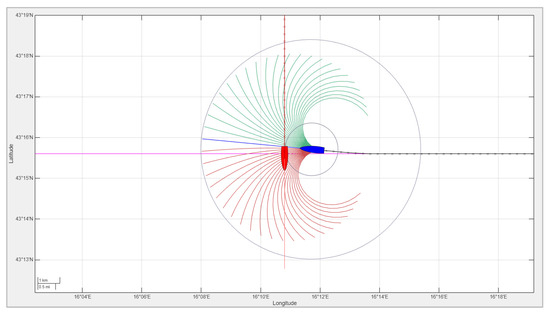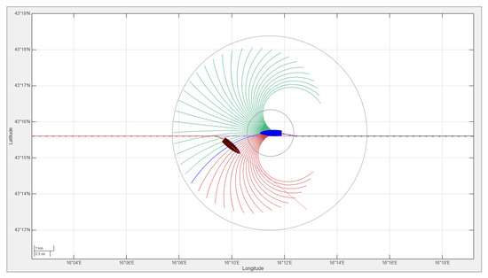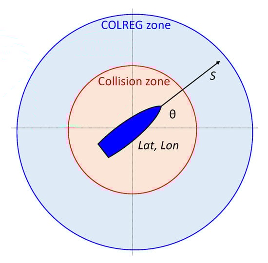 32], the concept of a ship domain is complex and asymmetric, with safe distances varying in different directions and depending on many factors. These include the own ship’s length, speed, and maneuverability, as well as the target ship’s size and speed, encounter angle, environmental conditions, and traffic density. While there is no single IMO-mandated standard for ship safety domain size, the values of the collision zone radius dCollision = 0.5 nm and the COLREG zone radius dCOLREG = 3 nm were chosen in this study as a balance between established ship domain models and practical implementation constraints in multi-ship encounter scenarios.