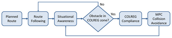 The proposed navigation framework consists of a hierarchically organized structure integrating global path planning and local collision avoidance into a coherent decision-making system. The core concept is that the ship continuously follows a planned route (route following) generated by the global planner, but switches to a collision avoidance mode when potential hazards are detected within the COLREG zone. During normal operation in the open sea without immediate hazards, the ship follows the pre-computed global trajectory defined by a sequence of waypoints. This process, referred to as route following, involves adjusting the vessel’s heading to remain on course while maintaining navigational efficiency. Route following assumes no immediate threat and allows for energy-efficient and direct transit.