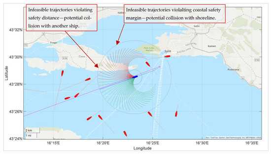 Figure 3. The own ship is depicted in blue, along with its current set of candidate trajectories. Infeasible trajectories (