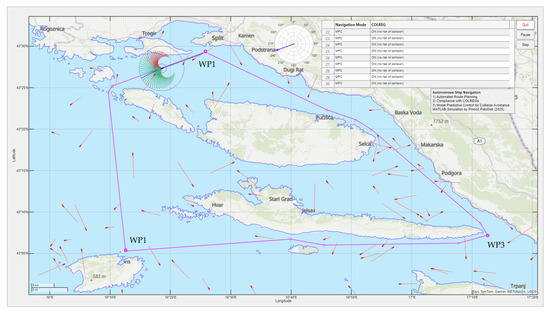 The simulation area was geographically defined in the Adriatic Sea and included the port of Split and the surrounding islands (Šolta, Vis, Brač, Hvar). Within this area, three initial waypoints (WP1, WP2, WP3) were set to define required stopovers, and a circular route—starting from the port of Split, passing Vis Island, continuing around Hvar Island, and returning to Split—was computed using the Theta* path planner (see