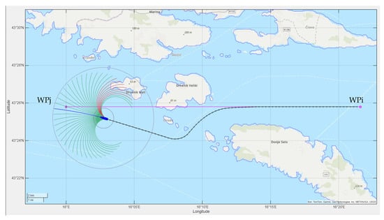 Let wi+1 be the next waypoint and θTarget (Equation (4)) be the bearing to the waypoint. If the vessel’s current heading θ(t) is within [−90, 90°] of the direction to the next waypoint (the ship is approaching the waypoint), the trajectory whose initial segment most closely aligns with the bearing to the waypoint is selected. Otherwise, the trajectory that ends closest to the next waypoint is chosen. This selection rule is expressed as follows: