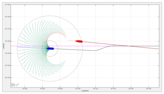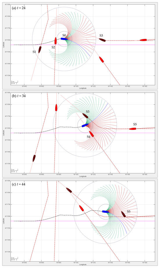 τ*, selected according to Equation (16), is highlighted in blue. The magenta line indicates the reference direction toward the next waypoint. Surrounding vessels are shown in red, with their headings and velocities represented as forward-pointing vectors.