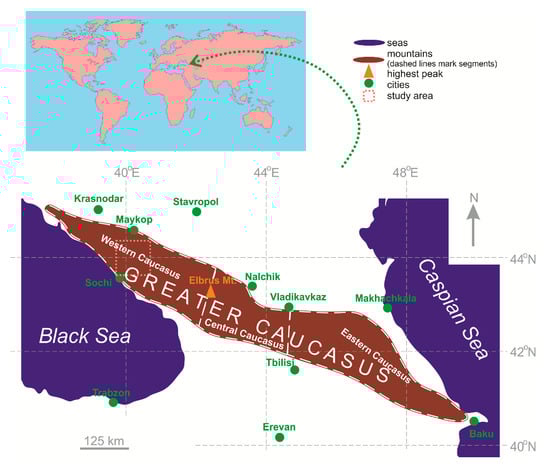 The Greater Caucasus is a major mountain chain between the Black and Caspian seas (Figure 1). It consists of three main segments, known as the Western Caucasus, the Central Caucasus, and the Eastern Caucasus. The former stretches from the western edge of the mountains to Elbrus Mountain (5642 m) (Figure 1). The study area is located in the central part of the Western Caucasus, which is distinguished by an extraordinary geological richness.