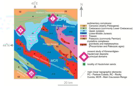 Hauterivian poorly lithified sandstones cropping out in the northern domain of the study area provide important insights into the sea–land interplay in the central Western Caucasus. These deposits were considered by Ruban [] and Mikhailenko and Ruban [], but their composition was not studied in detail. To fill this gap, Hauterivian sandstones were sampled at three stratigraphical levels in an abandoned quarry, which seems to be the most representative locality of these deposits. The rocks demonstrate only weak mechanical cementation, and their samples look like those of sands. The sampled levels characterize the lower member of the Hauterivian siliciclastic package, and the lower and upper parts of its upper member. These levels were chosen on the basis of the initial examination of sandstones, which permitted outlining three homogeneous units. If so, one sample from each unit seems to be sufficient for further analyses. The latter were carried out in the laboratories of the Institute of Geology and Petroleum Technologies of the Kazan Federal University (Kazan, Russia).