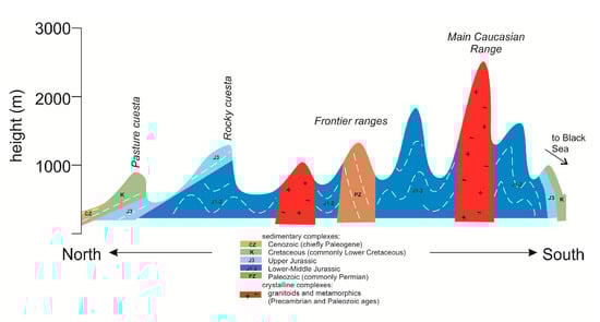 The geological history of the Western Caucasus, including the study area, is more or less clear from the beginning of the Jurassic. In the Jurassic–Paleogene, there were reletively deep back-arc basins separated by island arcs [], and marine sedimentation prevailed []. The tectonic activity was significant, and there were phases of deformation and partial/total uplift [,]. The growth of the orogen started in the late Cenozoic, and it has continued until nowadays [,,,,]. Continental environments expanded in the Western Caucasus in the second half of the Cenozoic.
