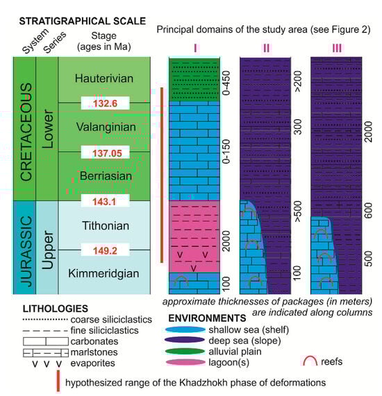 Synthetic Kimmeridgian–Hauterivian lithostratigraphy of the study area (numerical ages follow the recommendations of the International Commission on Stratigraphy []; unconformities are not shown due to the debated nature of the related surfaces [] or unclear position; the hypothesized range of the Khadzhokh phase of deformations after []).