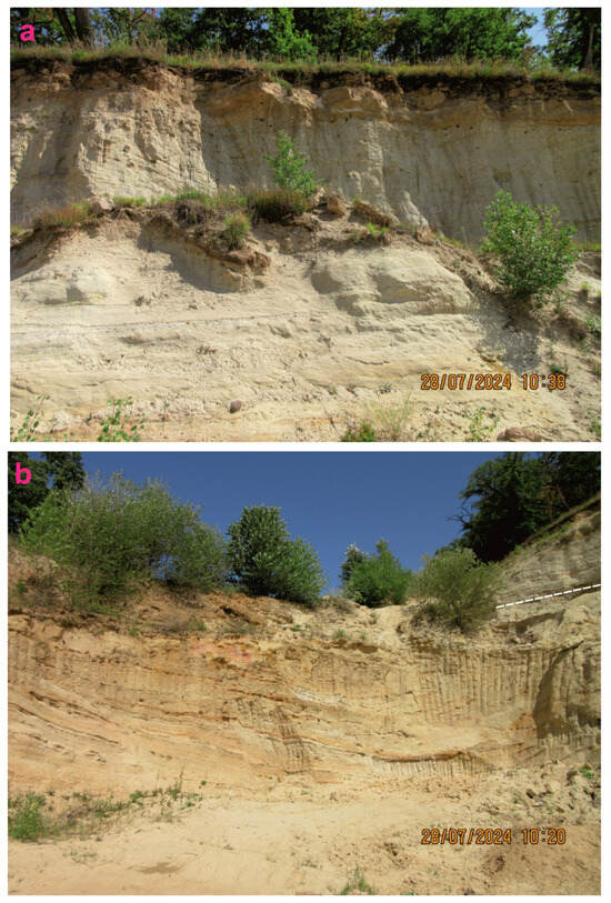 In their representative locality, Hauterivian deposits are sandstones that can be divided into two rather homogeneous members (Figure 5). The lower member has a visible thickness of ~20 m, and it is distinguished by cross-bedding. The upper member has a visible thickness of ~10 m, and it is distinguished by subparallel bedding. The former accumulated in an ancient channel, whereas the latter represents deltaic environments []. These sandstones are so poorly cemented that they look like modern sands.