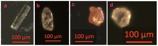 Selected mineral grains from the heavy fraction of Hauterivian sandstones at the main locality in the northern domain of the study area: (a) tourmaline, (b) zircon, (c) rutile, and (d) garnet.