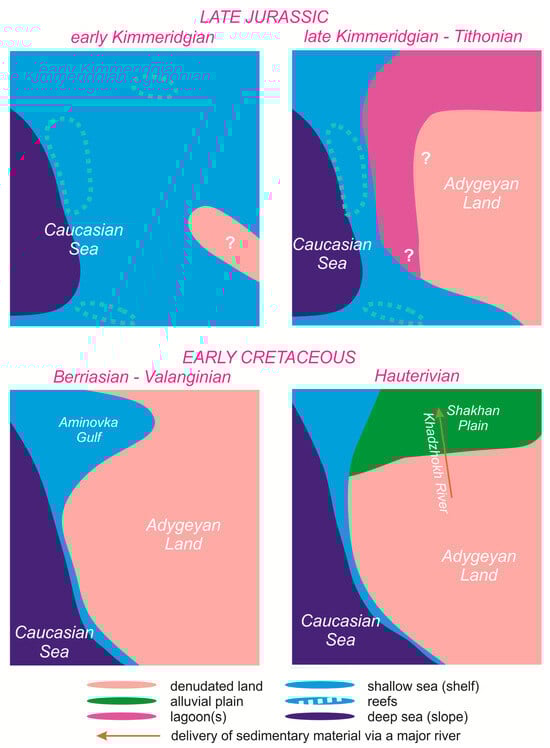 In the early Kimmeridgian, a significant part of the study area was covered by a shallow Caucasian Sea (Figure 8), where a large carbonate platform existed. Massive reefs marked its periphery, and this platform was a rimmed shelf. A deep basin was located in the western part of the area. A small land mass was hypothesized following the proposal by Guo et al. []. The situation changed dramatically in the late Kimmeridgian–Tithonian, when variegated siliciclastics with evaporites formed between the reefs in the west and a growing land in the east (Figure 8). The latter can be called the Adygeyan land following Drushits and Mikhailova []. Denudation of this land contributed to the accumulation of siltstones. This reconstruction faces uncertainty linked to the impossibility of determining the true extent of the package with variegated siliciclastics in the central part of the area. It is also important to note the genetic links between reefs and the deposition of evaporites and sabkha in the Greater Caucasus during the Late Jurassic [].