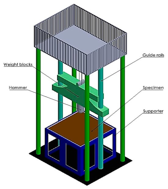 Figure 1 comprises a hemispherical hammer with a 150 mm diameter and a 1350 kg weight block, where the initial velocity of the drop hammer is 7.67 m/s (see