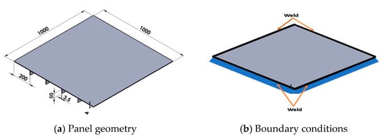The material model is defined as linear isotropic elastic perfectly plastic with a yield stress, modulus of elasticity, and plastic strain at failure of 235 MPa, 210 GPa and 0.3, respectively. To simulate the real boundary conditions of the experiment, the four edges of the SP plating are totally fixed, without imposing constraints on the attached stiffeners; see