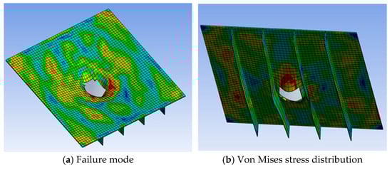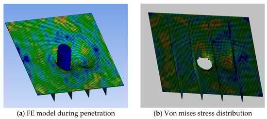 Figure 5, it is clear that the stiffened plane is fully penetrated by the hammer and that the rupture is petal-shaped, with visible lateral buckling of the adjacent stiffeners. Also, the von Mises stress distribution confirms the highly stressed locations within and near the penetrated area, with less effect of the impact on the far borders of either the plate or the stiffeners. This consistency further strengthens confidence in the accuracy of the FEM, supporting its reliability for use in present investigation.