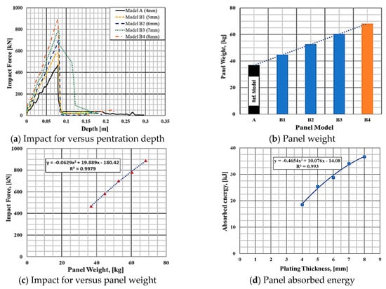 Figure 6a, as the plate thickness increases, the maximum impact force of the panel increases nonlinearly, with the impact capability increasing by 36.75% and 97.61% as the plate thickness increases to 5 mm (model B2) and 8 mm (model B4), respectively, with respect to the original model (A). This nonlinear increment may also be represented as a relationship between the panel weight for each model with respect to the corresponding impact force; see
