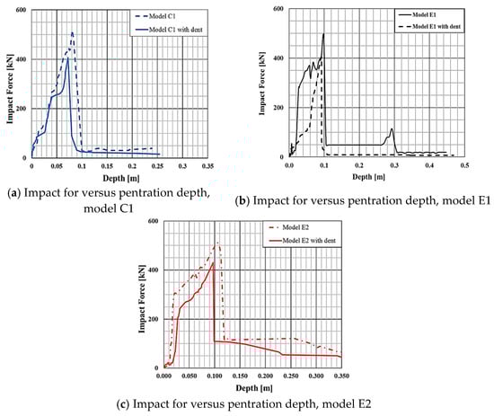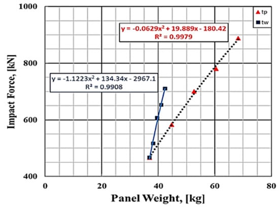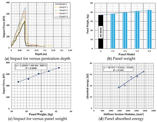 Figure 7a–c, by increasing the reinforcement section modulus, the panel weight increases and, respectively, the corresponding impact force of the panel increases; for model (C1) and (C4), the capacity increases by 10.78% and 52.24%, for modulus increases of 25% and 100%, respectively. This indicates that the relationship between impact force, weight, and section modulus may be fitted to a nonlinear function.