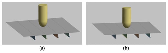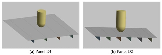 In the third group, the base plating thickness is constant at 4 mm (model A), while the stiffener spacing is variable. Two spacings are analyzed, as follows: 250 mm for model (D1) and 166.67 mm for model (D2), considering that the location below the hammer is unstiffened; thus, the spacing between the two stiffeners around the hammer is to be the stiffener spacing, as given in