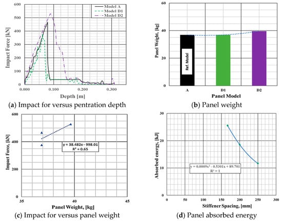 Figure 10d presents the relationship between stiffener spacing and the absorbed energy, and it is clear that, when the spacing decreases by 16.7%, the number of stiffeners increases, the panel weight increases, and the corresponding absorbed energy increases nonlinearly by 37.79%. On the other hand, when the spacing increases by 25%, with respect to the original spacing, keeping the number of stiffeners and the weight constant, the absorbed energy decreases by 37.12%.