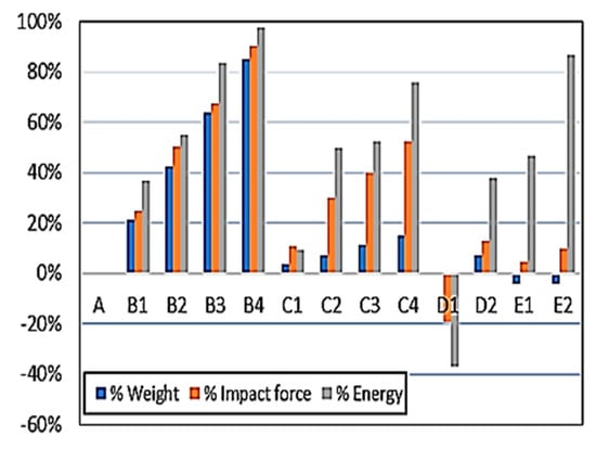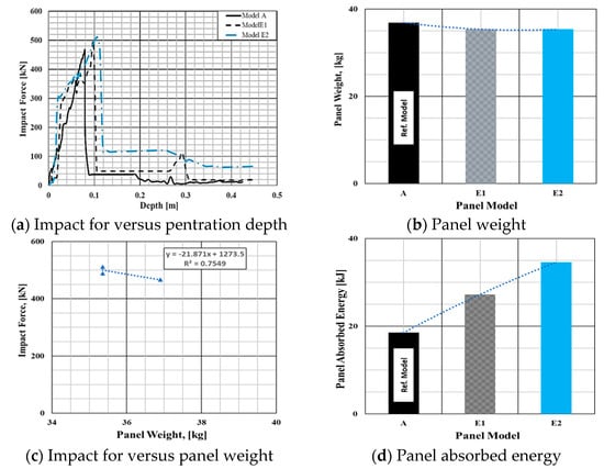 Figure 10b). The effect of this spacing decrement directly increases the panel impact capacity by 13.06% and the penetration depth by 10.94%, with respect to model (A), as may be seen from