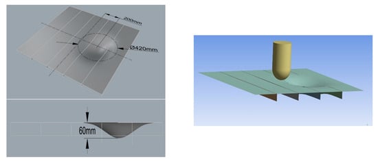 Figure 2. The path of the drop hammer is configured to act perpendicularly to the surface of the stiffened panel to ensure uniform contact and accurate penetration. Impact load is applied using the modelled hemispherical drop hammer of 150 mm diameter, with a falling speed of 7.67 m/s, which results in impact energy of up to 30.70 kJ.