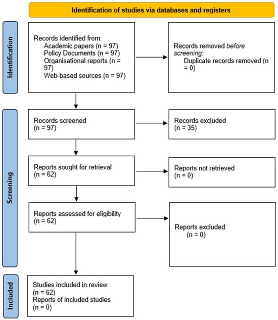 The titles and abstracts of all retrieved records were screened for relevance against the inclusion criteria. The project team members retrieved the full texts of potentially relevant documents and assessed them independently for correctness and objectivity. This process included 62 documents (45 academic papers, 3 policy documents, 8 organisational reports, and 6 significant web-based resources deemed credible and relevant) for the data extraction and synthesis review.