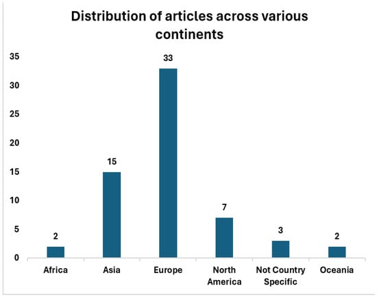 Figure 2 shows the distribution of articles across continents, with Europe contributing the highest number of publications (33), followed by Asia (15) and North America (7), while Africa and Oceania account for only 2 publications each. This imbalance highlights regional disparities in the academic exploration of port digitalisation. The dominance of European literature can be attributed to the continent’s advanced port infrastructure, strong research funding, and well-established digital governance frameworks that facilitate technological adoption and data availability. In contrast, the limited representation from Africa reflects underlying challenges such as weaker research capacities, lower investment in digital infrastructure, and economic constraints that hinder the deployment of advanced port technologies. These differences underscore how geographical and economic contexts significantly shape the maturity and visibility of digitalisation efforts in maritime ports.