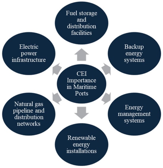 One of the most critical components of port infrastructure is energy infrastructure, comprising assets such as LNG terminals, offshore platforms, pipelines, and power transmission systems [5]. These installations are central to both national and global energy resilience. As part of the efforts to meet global decarbonization efforts, ports are increasingly integrating their critical energy infrastructure (CEI) with renewable systems, including offshore wind, hydrogen fuel networks, and solar installations [6,7]. The dual imperative of sustaining economic growth and addressing climate imperatives has transformed ports into strategic energy hubs. Yet, these systems operate in complex, exposed environments and are subject to cyber threats, regulatory fragmentation, and environmental risks [5,8].