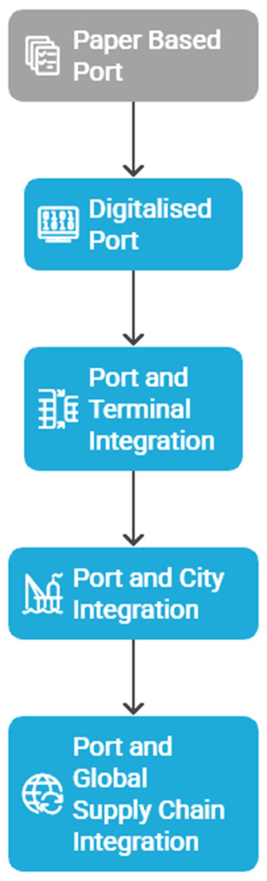 The digital transformation of seaports has evolved significantly over the years, and it has been shaped by three main generations: paperless procedures, automated procedures, and smart procedures [9]. Each generation is critical in improving port efficiency, reducing manual errors, and enhancing overall operations. This progression (shown in Figure 4) is key in addressing the increasing demands of global trade and supply chain efficiency.