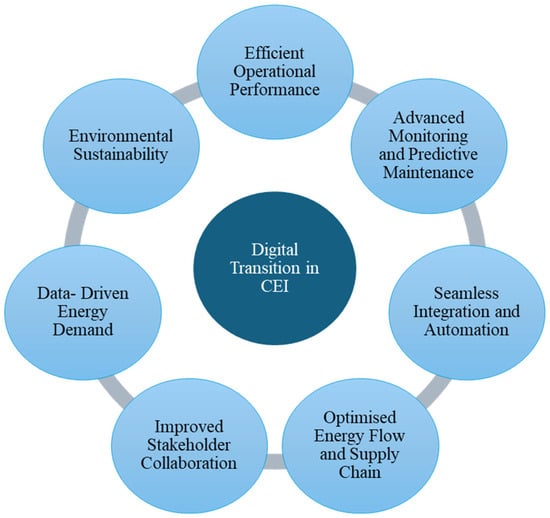 The evolution of digital transitions within port infrastructure has generally progressed through three distinct phases: digital documentation (paperless systems), operational automation, and the emergence of “smart ports.” [9]. Initially, digitalisation focused on transitioning from manual processes to electronic records. However, challenges such as fragmented data and poor system integration limited its impact [10]. Despite these advancements, significant disparities in adoption remain, with many ports yet to fully leverage digital capabilities for managing CEI [6,11]. Numerous challenges hinder the widespread and effective digital transition of CEI. Among the most prominent is the lack of an integrated digital strategy across port ecosystems. Many digital initiatives remain terminal-specific, reinforcing silos and reducing overall system coherence [9,12]. Furthermore, concerns over decision-making centralisation and inter-port competition limit collaborative innovation. The variation in digital maturity levels across stakeholders, particularly between developed and developing regions, further complicates implementation. Moreover, the absence of unified, cross-border regulations complicates efforts to secure shared infrastructure [6].