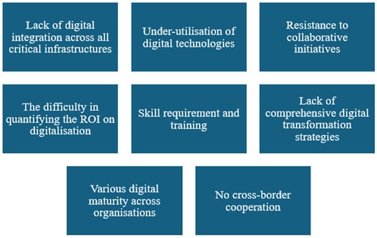 - The investigation revealed that (RQ3) digital technologies enhance CEI resilience through predictive maintenance, energy optimisation, and stakeholder coordination. Yet, their transformative potential is constrained by insufficient integration, underutilised data, and misalignment between stakeholders and governance structures. The study found that (RQ4) the key challenges to digital transition in CEI in maritime include skill shortages, resistance to collaboration, unclear ROI, and wide disparities in digital maturity. These factors weaken systemic resilience and delay the scaling of smart infrastructure across entire port ecosystems.