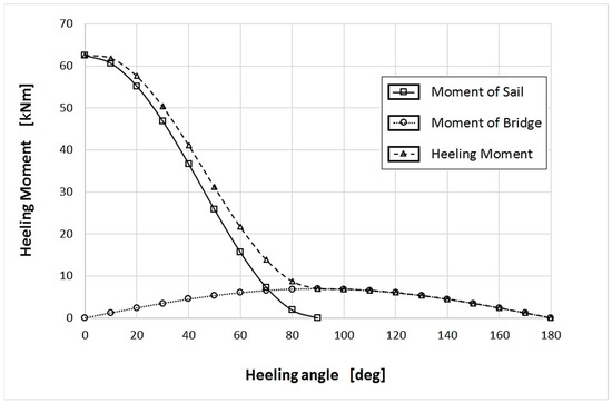 The effect of the sails is zero for heeling angles greater than 90°, while the effect of the bridge acts up to α = 180°. The plot of the heeling moment is shown in Figure 1.