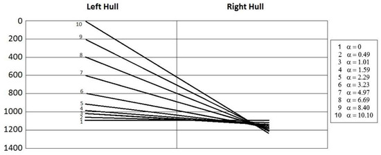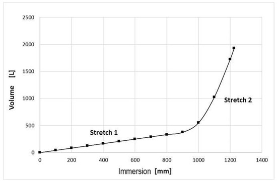 For immersions up to 900 mm, the curve represents the hull’s drift and follows a linear trend (stretch 1); the second part of the curve is relative to the keel and has a nearly exponential trend (stretch 2). Considering that the total weight of the boat is 1930 kg, when α is equal to zero, the immersion of a hull is 191.2 mm. As heeling increases, one of the two hulls will displace more and more weight up to a maximum of 1930 kg, while the weight displaced by the other hull will progressively decrease until fully emerging from the water. Figure 3 shows how the hull immersion varies as a function of the heeling angle.